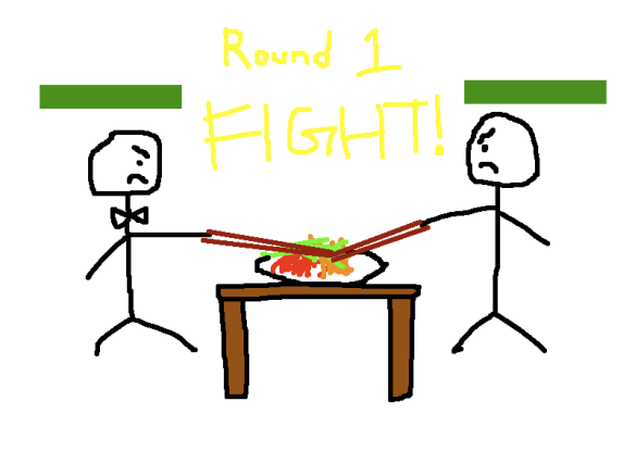 Lately I’ve also come to realized that most of the messes are due to the fact that each diner is trying to toss their way up to prosperity until the whole thing denigrates into a chopsticks battlefield. This is made worse when you consider the fact that each person is using a pair of extra-long chopsticks. Extra-long chopsticks = extra ammunition and rage.